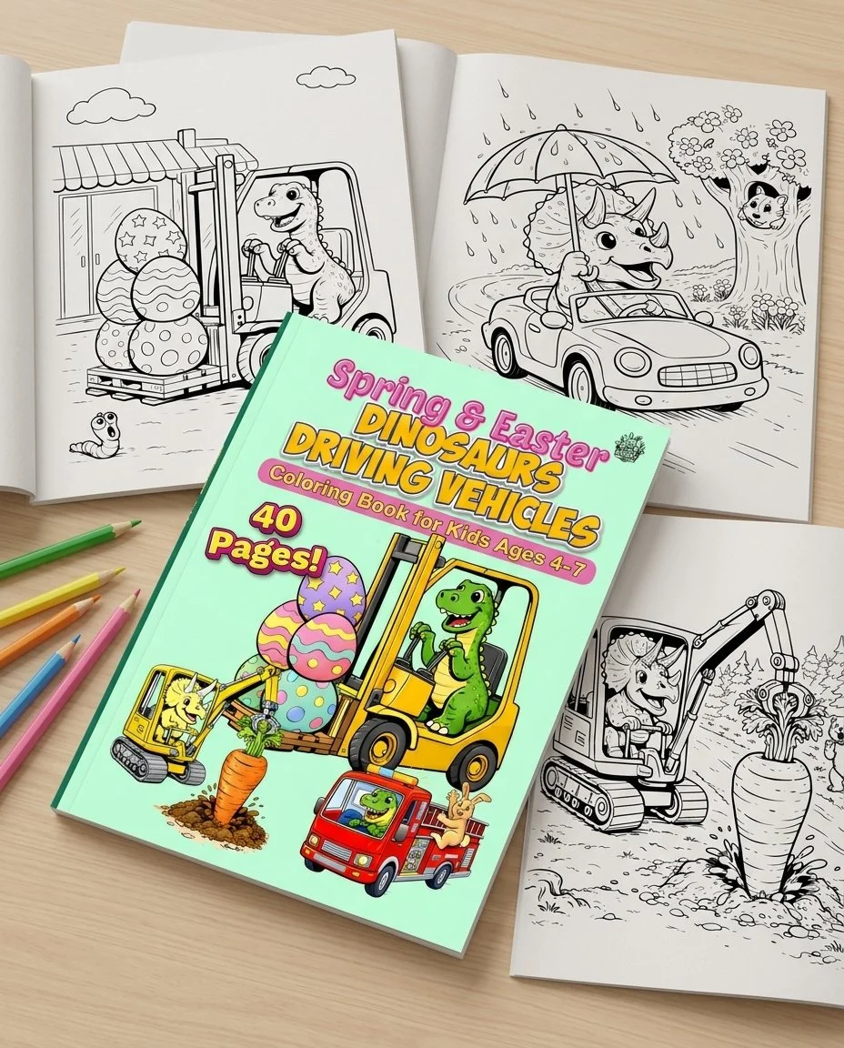The Spring & Easter Dinosaurs Driving Vehicles coloring book. Filled with 40 unique Spring & Easter themed illustrations for hours of fun!